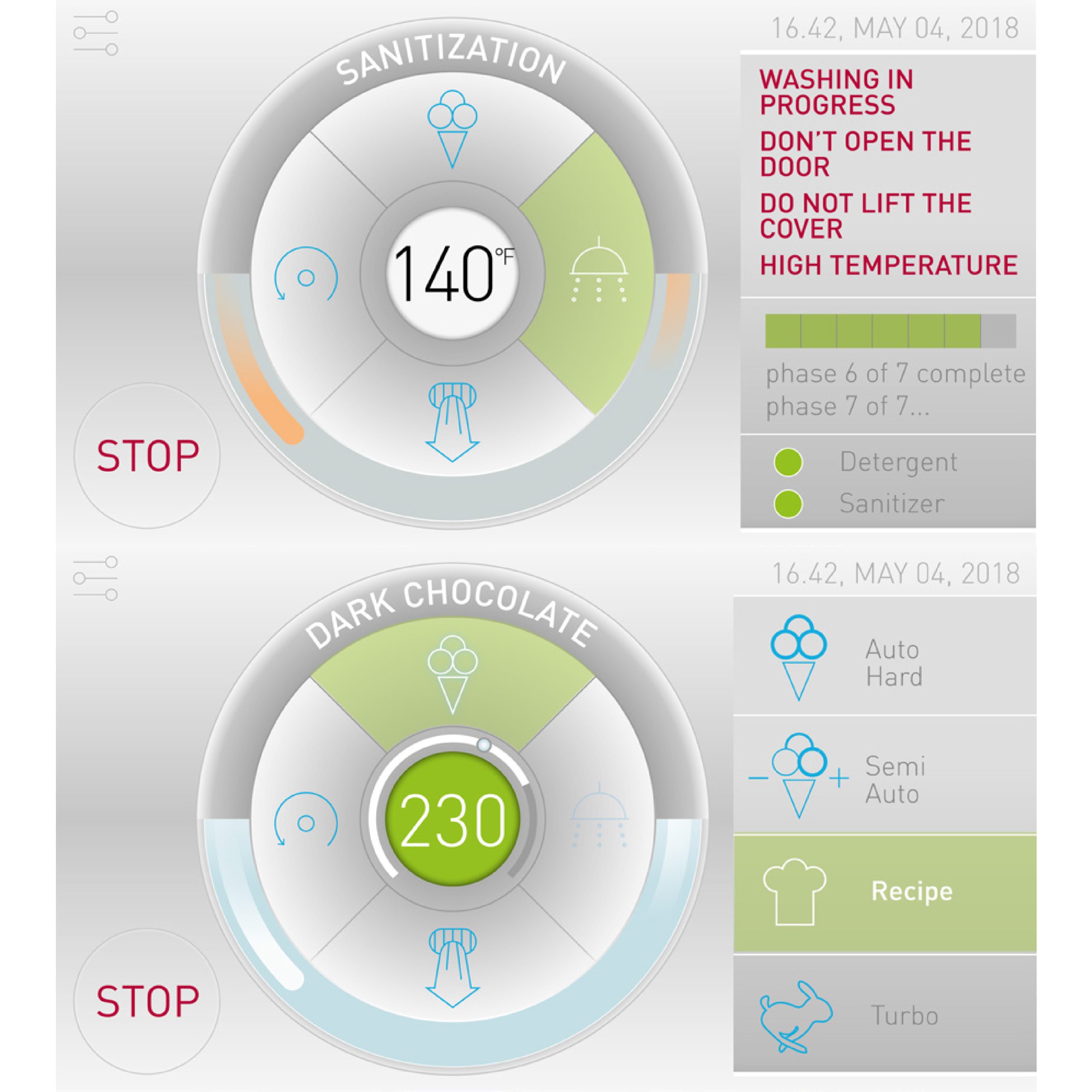 TWIST, the first self-cleaning batch freezer on the market, designed by Frigomat, stands out for a number of peculiarities. It is the first and only gelato machine that can be easily and quickly washed and sanitized with a simple ‘click’, activating the pre-set washing programs. The touch screen interface is a Frigomat exclusive property. Unique and stylish, a, with a simple, clear and intuitive graphic system for the control and command of all the main functions. Unique is also the innovative and ergonomic design, which meets the functional needs without forgetting the aesthetics.