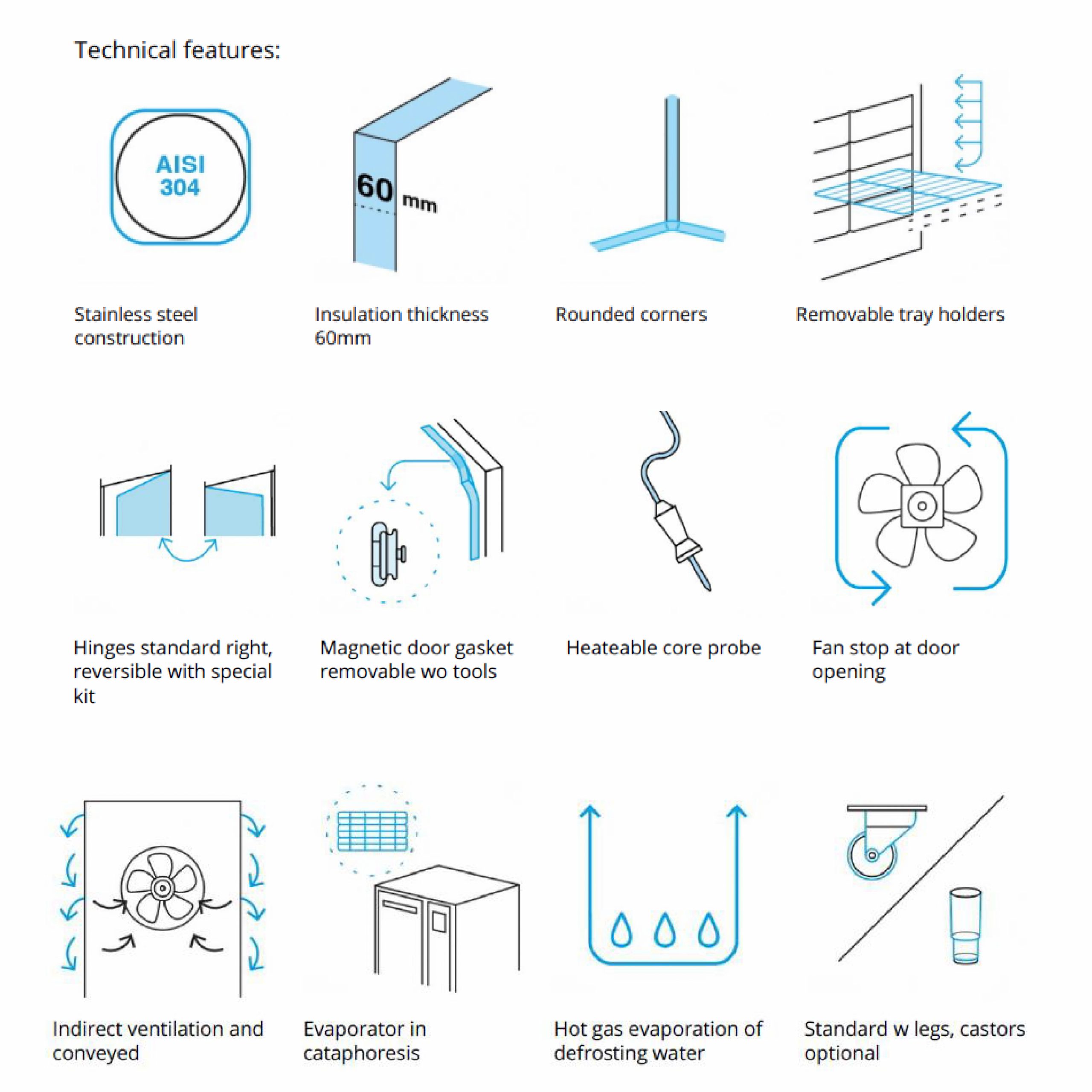 - NO-TIPPING removable pairs of guides in AISI 304 stainless steel, can be interlocked – every 20 mm for GN1/1 or 600×400