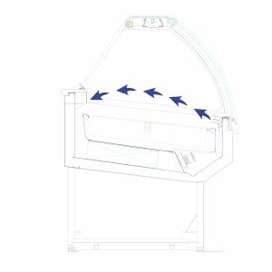 - spring mechanism, service side closure with wraparound curtain or sliding Plexiglass doors.