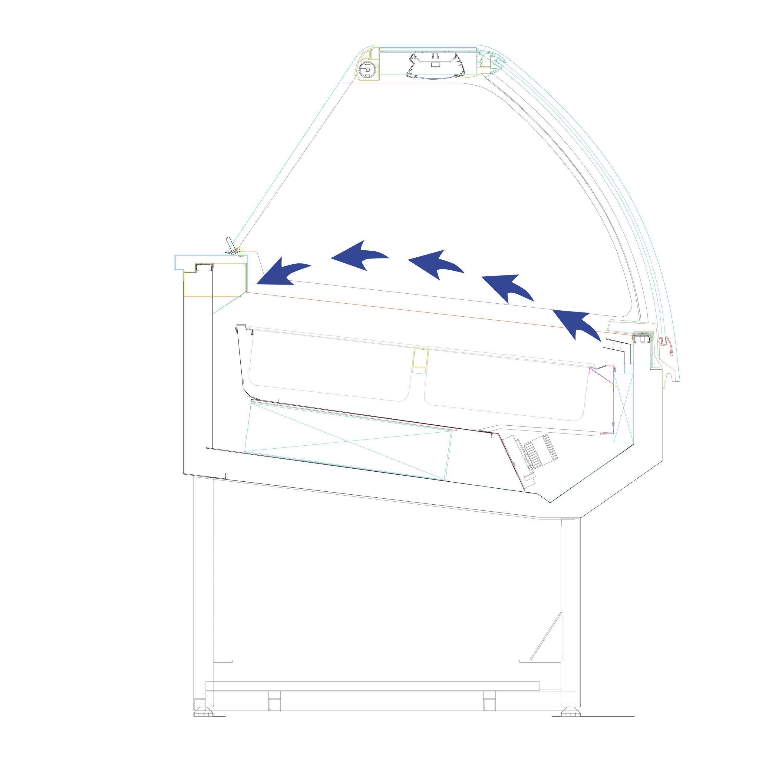 - Anti-condensation heated glass superstructure, front glass openable from top to bottom by means of a gas